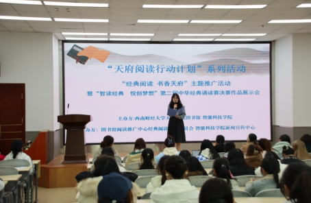 12月6日,由学校图书馆、智能科技学院联合主办的天府阅读行动计划系列活动之“经典阅读 书香天府”主题推广活动暨“智读经典悦创梦想”第二届中华经典诵读赛决赛评选在实验楼110举行。智能科技学院直属党支部书记常荣、图书馆副馆长武同雁和图书馆3位老师担任决赛评委,参赛团队代表以及观赛师生等共计160余人参与了现场活动。
