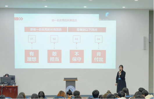 在团课学习环节中,团总支、学生会组织部徐阳洋带领全体成员一起唱响团歌,并深入了解共青团的光荣传统和历史,她激励同学们坚定理想信念,为中华民族伟大复兴而努力奋斗。团总支、学生会书主处代表侯虹君发言,他强调,学生会是学生与学校之间的桥梁和纽带,要完善规章制度,加强交流合作,充分发挥作用,为同学们提供更好的服务。