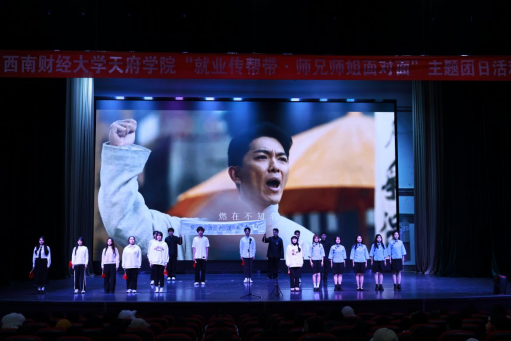 活动以全场齐唱《光荣啊,中国共青团》拉开序幕。随后,蒲虹宇上台致辞,她强调将个人梦想与祖国伟大成就相结合的重要性,并提出大学生毕业就业创业的三个关键要素:坚定理想信念、勇担时代责任;不畏艰难险阻、投身国之大者;勇于积极迸发、具有创新精神。蒲虹宇简洁的发言向学生传达了党的声音和指示,体现了党和团对学生的关怀和指引,引导学生树立正确的就业观念,为实现个人价值和国家发展作出积极贡献。