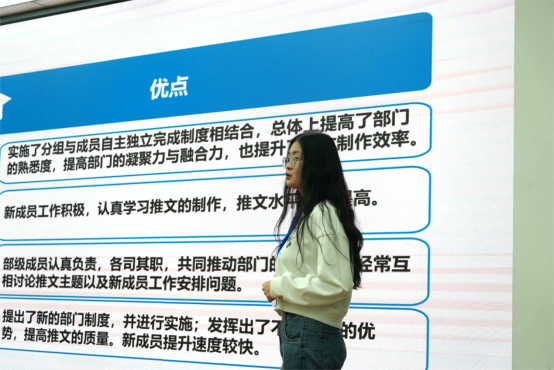 会上,全体成员齐唱部歌。随后,综合办公室、官方公众号编辑部、官方微博空间编辑部、天府记者团和小天微视负责人分别从工作概述、本学期工作安排、成果分析及不足和对未来工作的展望四个方面进行了工作汇报。此次汇报不仅总结了寒假期间各部门的工作成果和对未来工作的规划,还体现出了成员们对新学期工作的热情与期待。