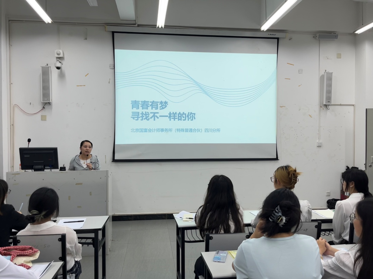 9月22日,会计学院与北京国富会计师事务所(特殊普通合伙)四川分所携手打造的“北京国富—西财天府四川电信财务共享项目人才培养订单班”第六期宣讲会在成都校区(西区)1-201举行。宣讲会由会计学院校企合作办公室主任史天玥主持,北京国富会计师事务所(特殊普通合伙)四川分所审计五部主任熊彦婷主讲,两百余名2022级学生参与了本次宣讲会。
