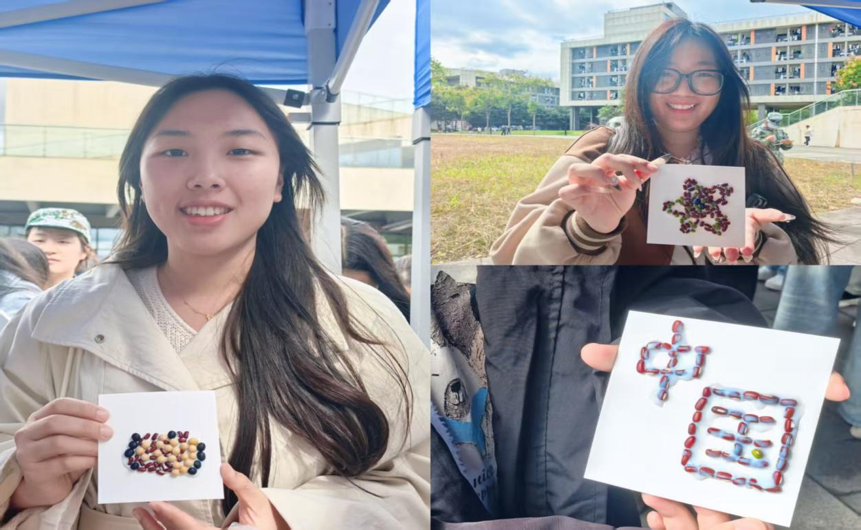 第二项活动“五谷绘秋·韵染重阳”,以“五谷”这一源自大地的馈赠为创作媒介,让传统文化回归生活本真。学子们巧用小麦的金黄、豆类的深褐,在画板上拼贴出重阳登高、菊花绽放、寿桃献瑞等意象,每一粒谷物都是自然的印记,每一幅作品都是情感的投射。五谷不仅是滋养生命的食粮,更成为传递“尊老、敬老、爱老”美德的载体——当学子们专注于谷物的排布与构图时,传统孝道不再是书本上的概念,而是化为指尖的温度、画面的温情,在潜移默化中完成了一次对中华传统伦理的沉浸式传承。
