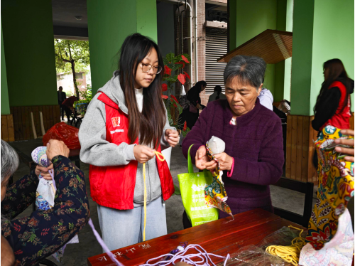 社区工作人员为大家详细讲解本次活动中艾草锤的制作方法,支部师生与社区工作人员分组协作,开启了艾草锤的制作工作。活动过程中,李思佳、朱琳、芶宇婧耐心地协助社区老年人完成艾草锤的制作。活动现场,支部师生与社区老人携手制作艾草锤,进一步加深了对传统节日文化的认识,大家共同度过了一段短暂却欢乐的时光,切实增进了校社联动。