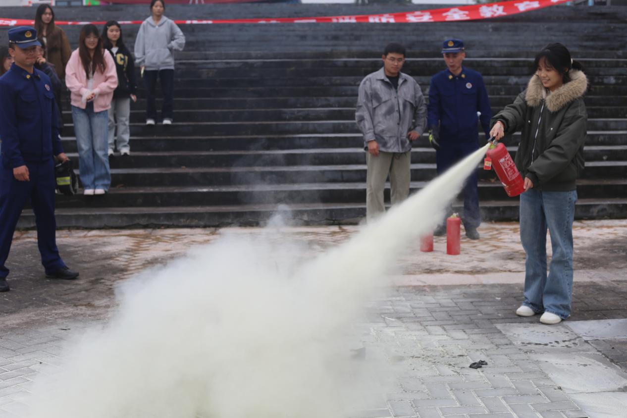 讲座伊始,唐正波以近年来国内高校典型火灾案例为切入点,生动阐述了校园消防安全对于守护师生生命财产安全、保障教学秩序不可替代的重要性。他从消防基础知识切入,系统讲解火灾的定义、分类及燃烧三要素等核心内容,帮助师生建立对火灾风险的科学认知;重点围绕消防安全“四个能力”建设,即检查消除火灾隐患能力、组织扑救初期火灾能力、组织人员疏散逃生能力、开展消防宣传教育培训能力。此外,唐正波通过现场演示与步骤拆解相结合的方式,详细说明灭火器的正确使用方法,并提醒师生疏散时保持冷静、善用通道、勿乘电梯,牢记“生命至上”,提升自救互救能力。