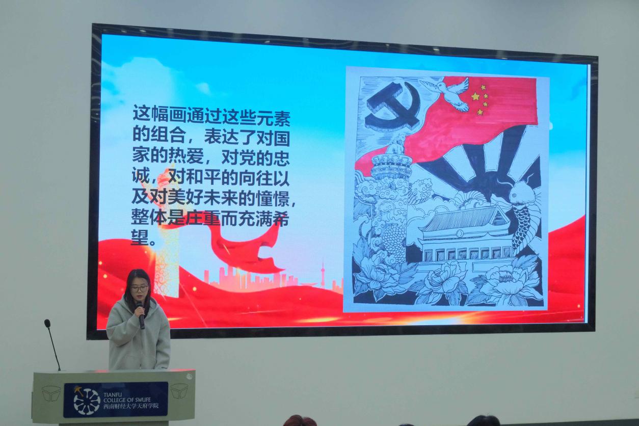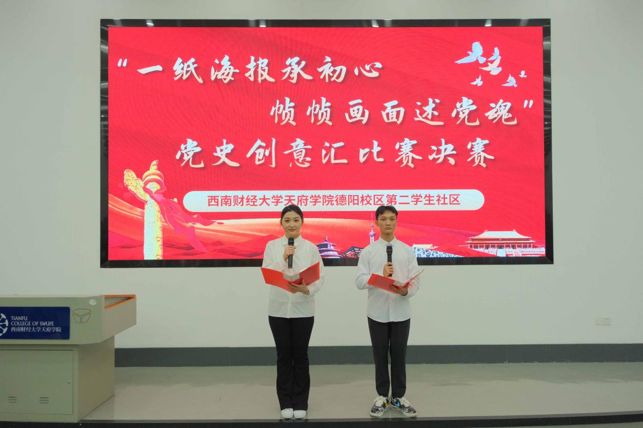 11月11日,西南财经大学天府学院德阳校区第二学生社区“一纸海报承初心,帧帧画面述党魂”党史创意汇比赛决赛在B101教室圆满落幕。决赛邀请了康养护理学院学生党建办公室指导老师陈心悦、郑仁敏以及辅导员代表王翰麟担任评委。