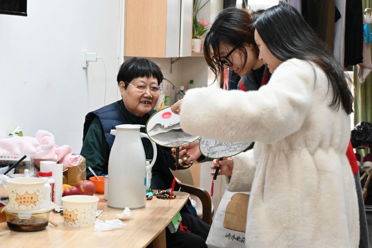 在与老人们逐渐熟悉之后,志愿者们将提前准备好的牛奶等慰问品送到老人手中,同时递上学生亲手制作的手工艺品,并协助他们佩戴手链、搭配挂饰。灵动的饰品映衬着老人们的笑容,整个现场弥漫着温馨和睦的氛围。