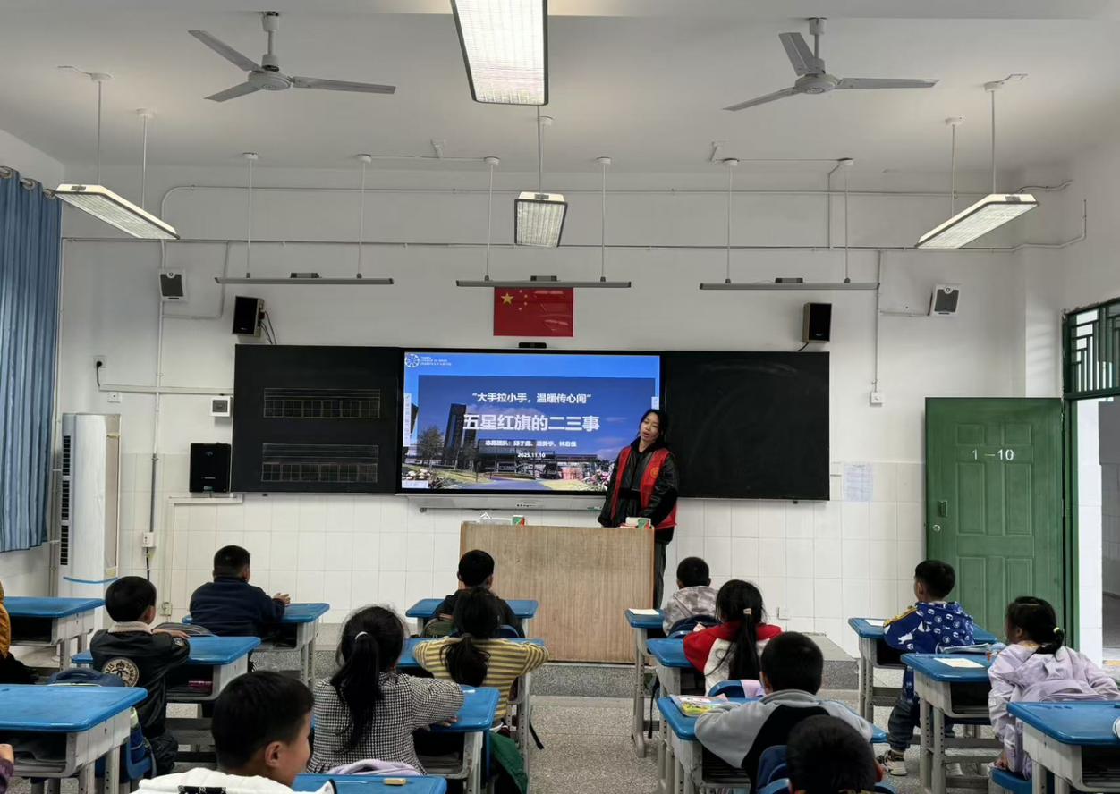 旗帜引领方向,红星照亮童心。11月10日,西南财经大学天府学院德阳校区第一学生社区的支教团队走进鄢家小学,开展一场以“五星红旗的二三事”为主题的爱国主义支教活动。本次活动旨在通过生动有趣的讲解与互动,引导孩子们认识国旗、理解国旗、守护国旗,在幼小的心灵中深植爱国情怀。