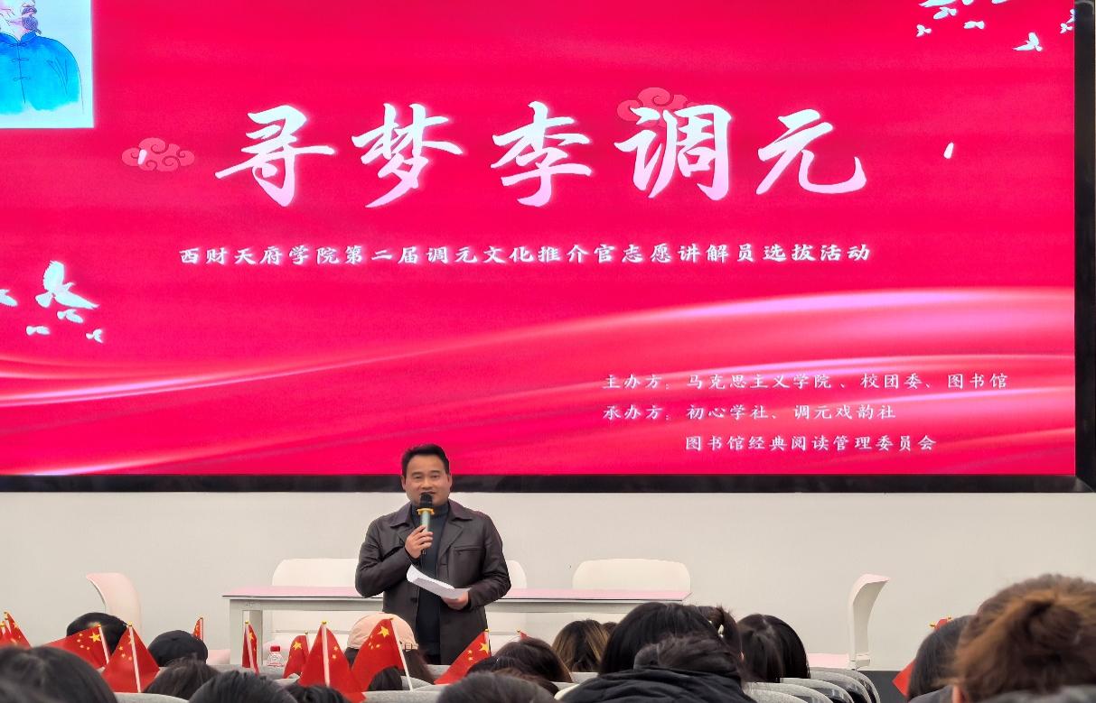 11月25日,“寻梦李调元”——西财天府学院第二届“调元文化推介官”志愿讲解员选拔活动决赛在西财天府学院德阳校区圆满落幕。本次活动由学校马克思主义学院、校团委、图书馆联合主办,旨在进一步挖掘调元文化的时代价值,选拔中华优秀传统文化传播者,持续弘扬地方特色文化,深化校园文化自信建设。德阳市罗江区博物馆馆长李刚,西财天府学院图书馆副馆长都丽,马克思主义学院教师胡金亮、叶璇,图书馆老师蒲婧受邀参加活动并担任评委。