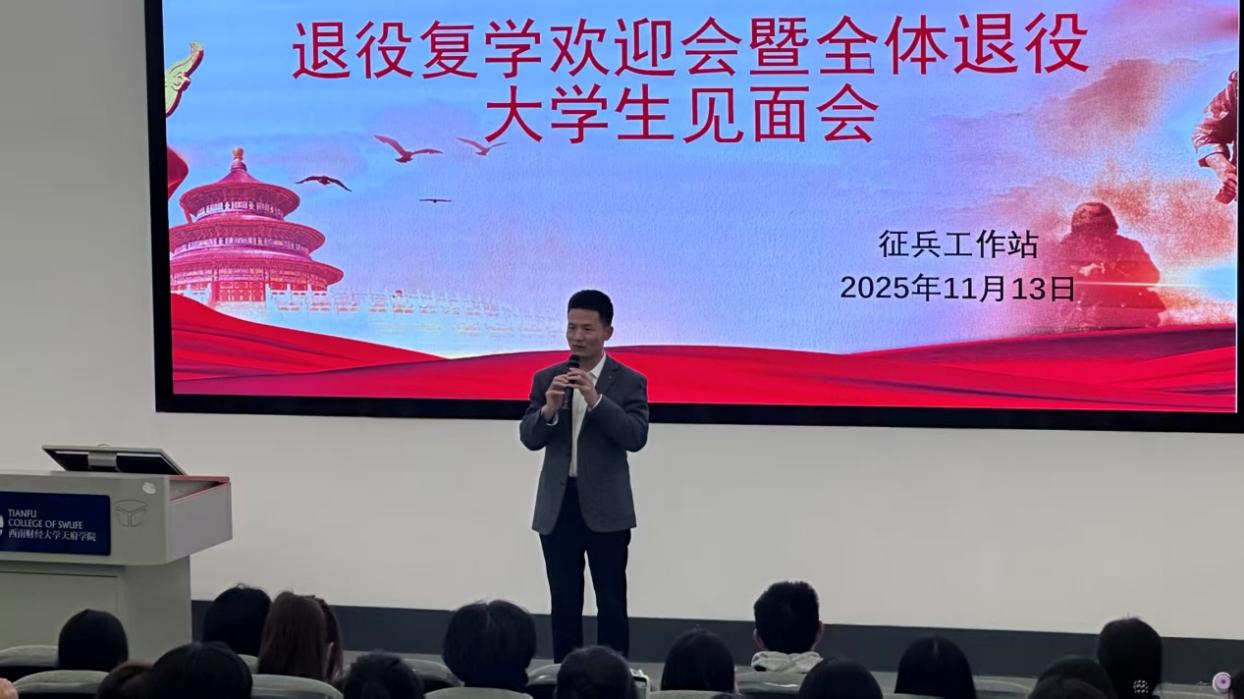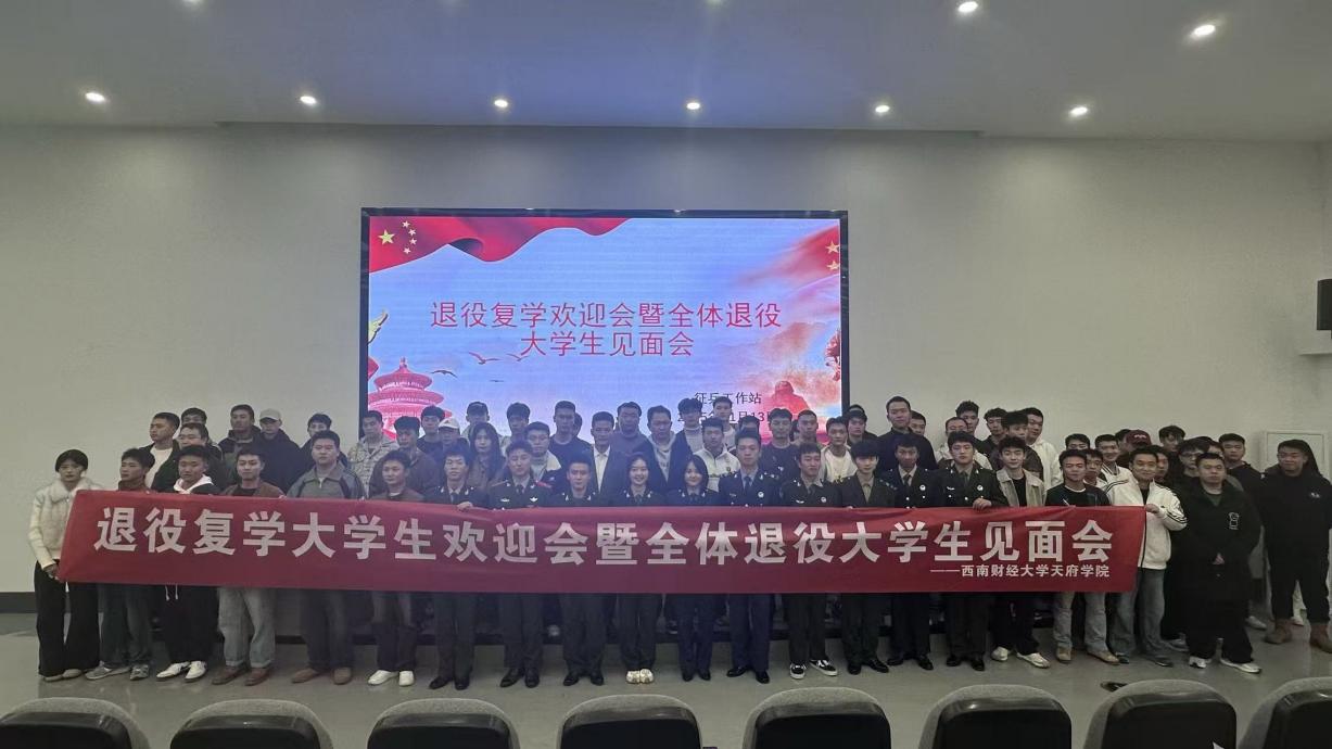 近日,西南财经大学天府学院在德阳校区B101报告厅举办退役复学学生欢迎会暨全体退役大学生见面会,党委学生工作部副部长严飞雷、征兵工作站副站长邱长江、会计学院国防教育负责老师袁海航、艺术与传媒学院国防教育负责老师陈佳慧出席活动。德阳校区全体退役复学学生、意向参军学生参加本次活动。