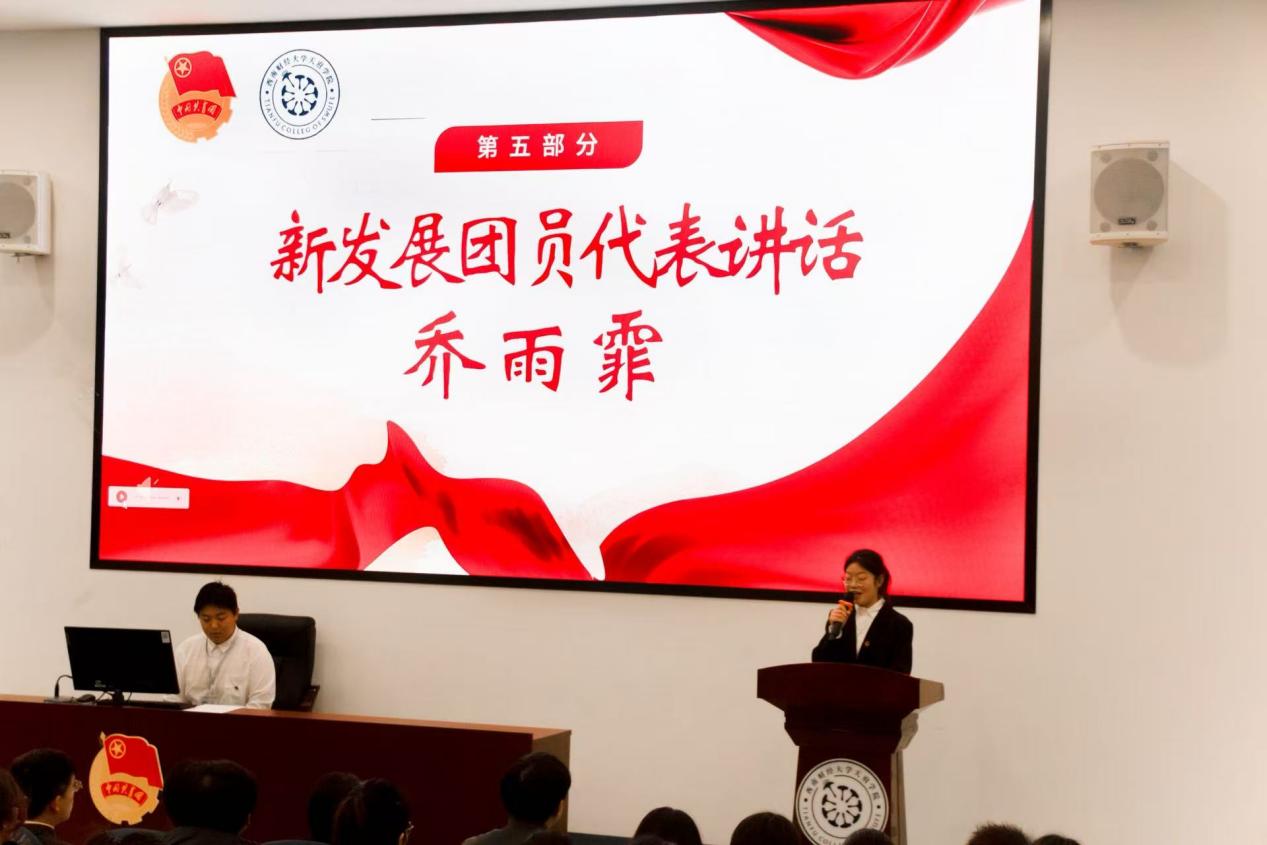 全体宣誓后,新发展团员代表乔雨霏发言,承诺将砥砺政治品格、淬炼专业能力、培育良好作风,以青春之担当践行入团誓言,于守护人民健康与推动民族复兴的征程中焕发光彩。优秀团员代表李佳颖结合“一二·九”运动90周年的历史,向新团员表达祝贺与期望,分享“成为信仰坚定的举旗者、本领过硬的筑梦人、文明新风的引领者”的感悟,号召团员传承爱国精神,于奉献中展现青春风采。