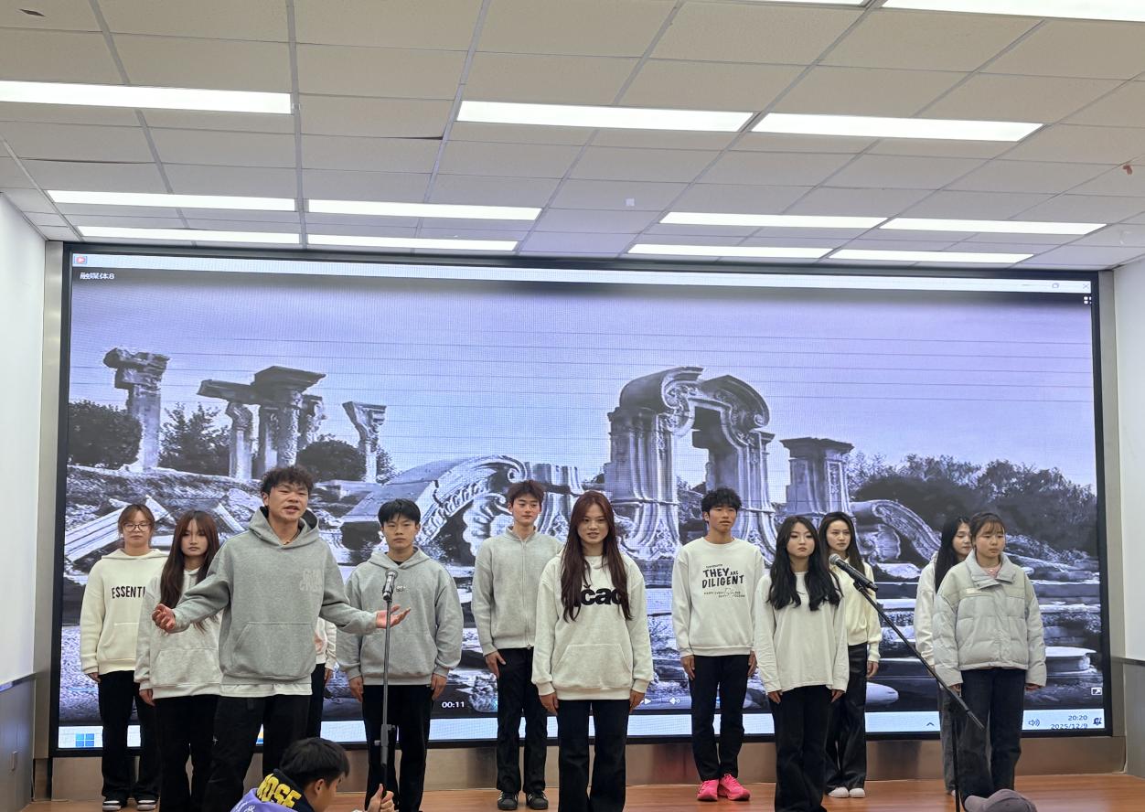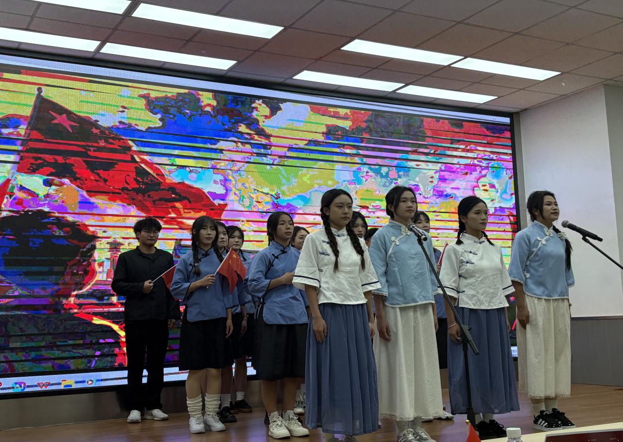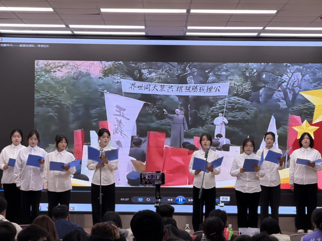 冯语薇组深情朗诵《万疆》,表演者身着红衣,在恢弘的爱国影像背景下,以铿锵之声抒发赤子情怀;李秀红组的精彩朗诵,让我们重温了觉醒年代的热血与赤诚;向志睿组演绎《燃血青春:铭记一二·九》,同学们身穿民国学生装,于绚丽背景前慷慨陈词,再现青春热血;融媒体团队深情演绎《青春中国》,以历史影像为衬,传递厚重爱国情怀。朗诵皆感情饱满,展现了学子们深厚的爱国热情与时代担当。