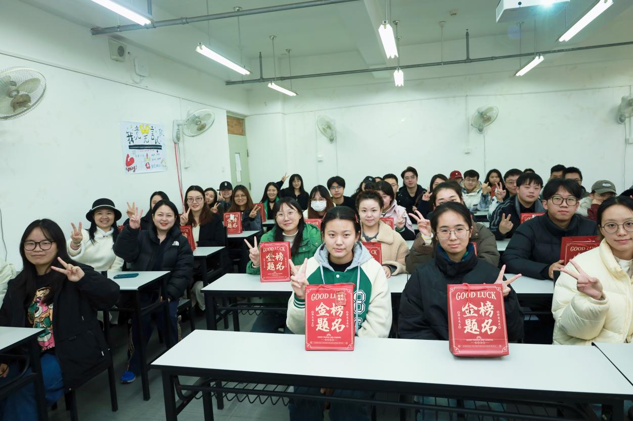 随后,陈真子带领毕业班辅导员团队走入学子中间,逐一将“金榜题名”主题暖心礼包送至学生手中,与学子们面对面倾心交流。老师们细致询问复习进度、备考难点与生活需求,叮嘱大家既要保持冲刺姿态,更要筑牢健康底线,通过科学作息校准备考状态,以沉稳心态应对考试挑战。礼包以寓意喜庆的红色手提袋承载,内含“笔锋破局”0.5mm黑色战笔、“深耕不辍”前程似锦车线本、“精准规划”未来可期便利贴、“度量理想”一帆风顺套尺及“笃行致远”心想事成贴纸包。每一件物品既兼顾备考实用属性,更蕴含学院“经世济民、孜孜以求”的育人初心,化作照亮研途的“星灯”,温暖学子前行之路。