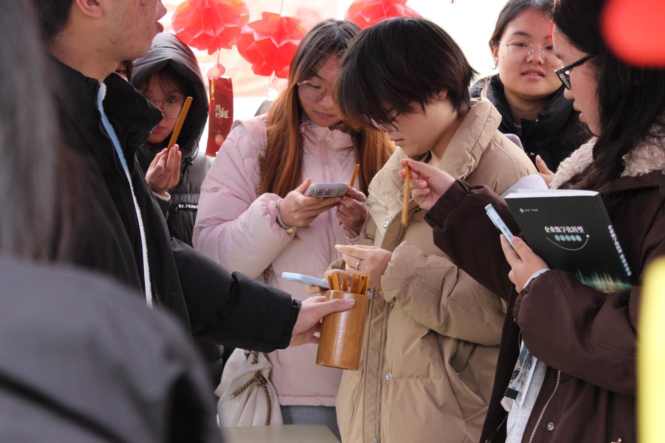 笔墨含情,联语寄心。汉服社与雷锋站联袂,铺展红纸、研墨挥毫。同学们书写“福”字融入百福长卷,亦可借鉴或自创对联,以“书山筑梦”“学海扬帆”等句抒发新年壮志。一横一竖凝祝福,一撇一捺书新愿,让翰墨清香伴随大家共迎春光。