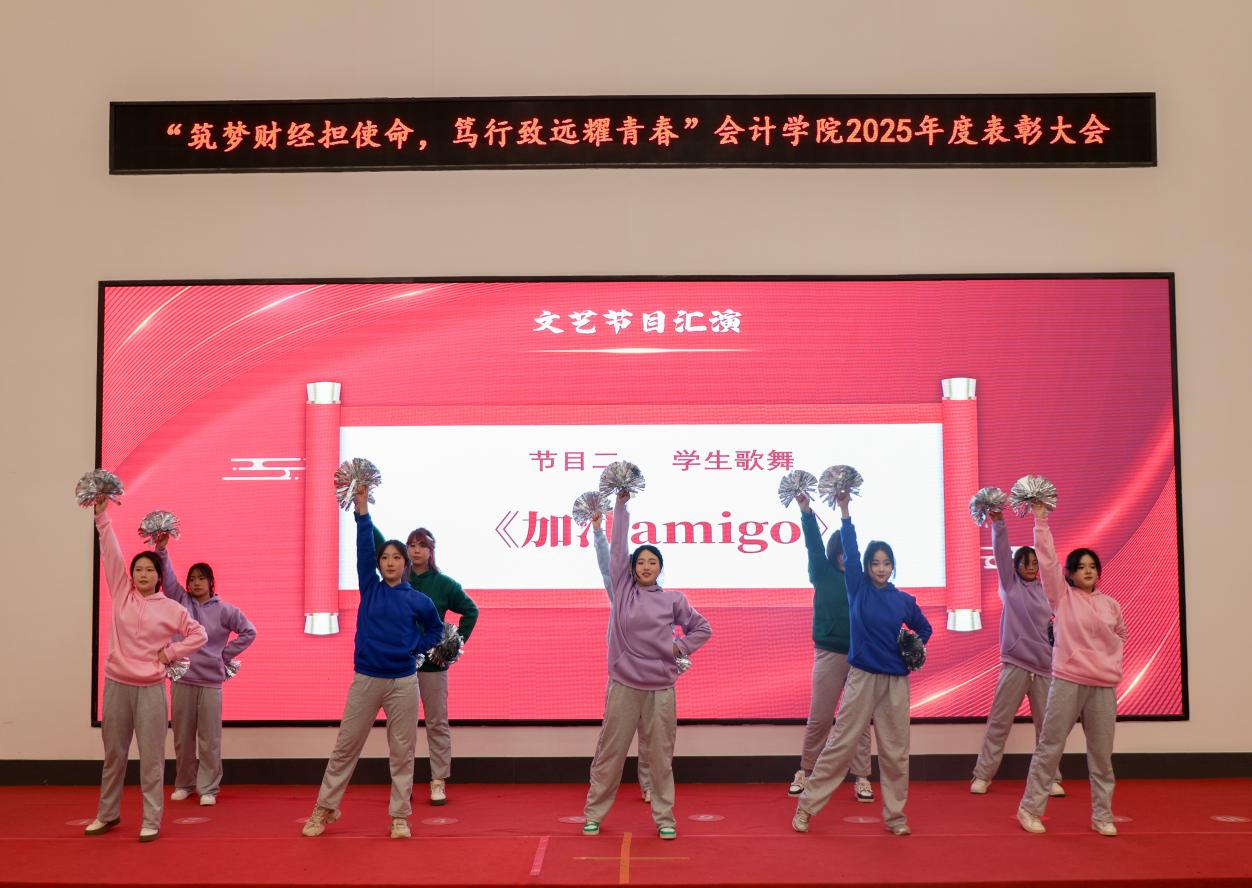 表彰间隙,会计学院艺术团带来了精彩纷呈的文艺表演。诗朗诵《数算青春,账绘未来》以铿锵有力的语调诉说着财会学子的理想与担当,舞姿灵动的团体操《加油amigo》展现了新时代青年的蓬勃朝气,悠扬的合唱《夜空中最亮的星》传递着逐梦路上的热忱与坚定,精彩的演出将现场气氛一次次推向高潮,充分彰显了会计学院师生全面发展的综合素质与昂扬向上的精神风貌。