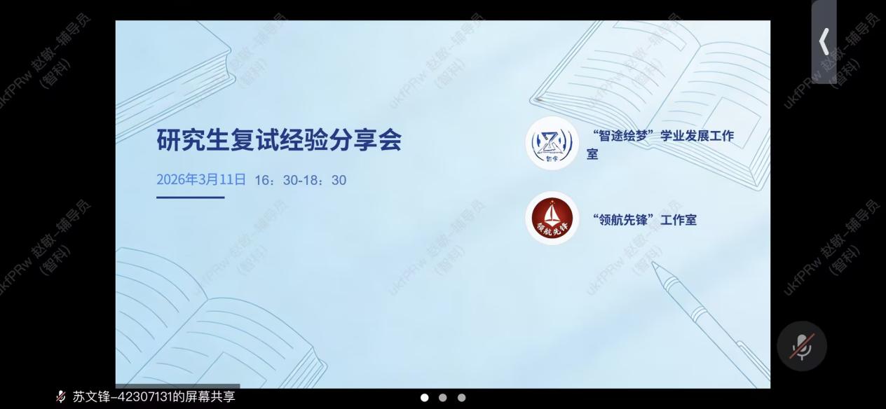 为帮助考研学子全面了解复试流程,提升复试综合竞争力,3月11日,智能科技学院“智途绘梦”学业发展工作室与“领航先锋”工作室联合开展了考研线上复试经验分享会。本次分享会由2025届研究生“上岸”学子王鑫(录取到重庆理工大学人工智能专业)与张景裕(录取到西南科技大学地质工程专业)主讲,学院2022级备考学子参加。