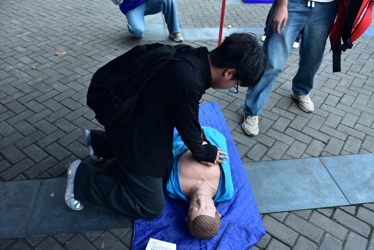在互动体验环节,现场设置了防护用具展示区、应急救护实操区,工作人员手把手教同学们正确佩戴安全帽、防护手套等劳保用品、展示心肺复苏及海姆立克急救法等应急救护技能,同学们积极参与、亲身体验,在实践中掌握实用的安全防护技巧。同时,工作人员向同学们发放了工伤预防宣传手册、急救包等物资,方便大家随时随地学习工伤预防知识,实现线上线下宣传全覆盖。