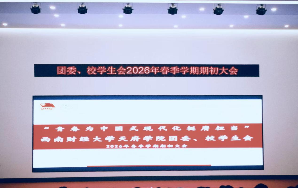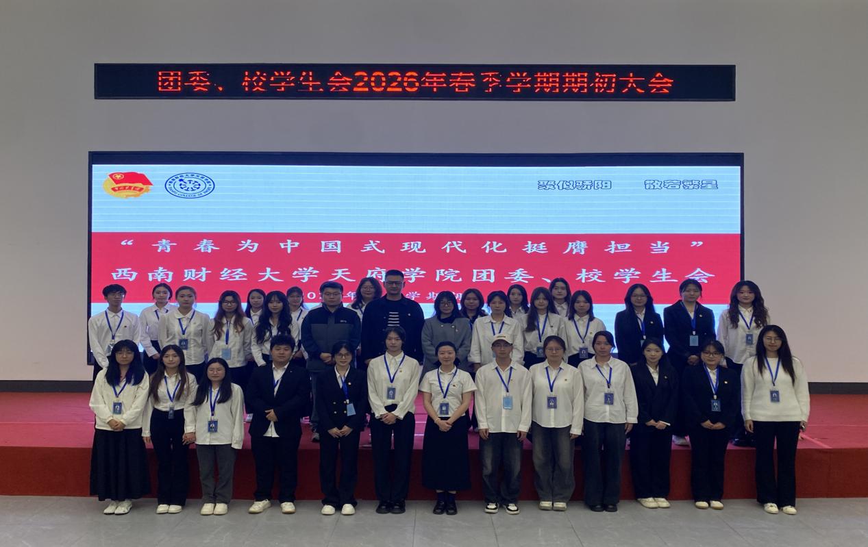 春和景明启新程,青春担当赴新约。为凝聚青年力量、明晰工作方向,西南财经大学天府学院团委、校学生会近日在德阳校区C203报告厅组织召开了主题为“青春为中国式现代化挺膺担当”的2026年春季学期期初大会。团委副书记车学文,团委指导老师范兴娴,学工部老师邱长江,以及全体团学干部共同参会,为新学期工作开篇布局、凝心聚力。