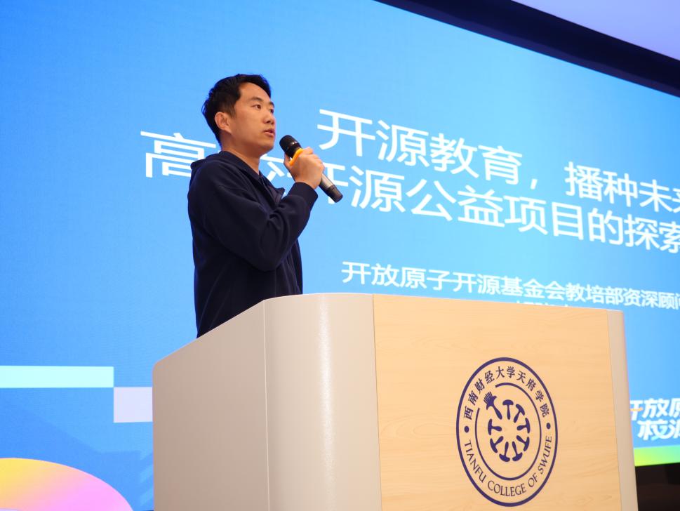 在致辞环节,智能科技学院院长徐鸿雁强调,开源体现了开放共享的精神,是科技创新与人才培养的关键。学院将开源技术作为重要发展方向,鼓励师生通过“西财天府卓越工程师孵化中心”和“开放原子开源社团”积极参与开源社区,提升专业能力,贡献开源生态。
