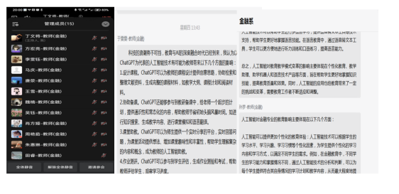 会前,学院金融系、经济系分别组织了对《Chatgpt冲击下教育数字化转型升级的新路径》文件的研讨学习。会议集中讨论了人工智能发展背景下如何实现教学工作的转变,老师们各抒己见,从不同角度阐述自己的观点。会上,金融系教师罗震宇、唐玥、赵潇澍,经济系教师朱惠琳、林诗达、方宏亮,以及学工代表刘秀分别进行了代表发言,分别就人工智能在教育教学中的应用、机会与挑战等方面进行了深入探讨。会议研讨一致认为,人工智能技术辅助教学已成为未来发展趋势,颠覆了传统教学模式,带来了个性化、自适应、智能化的教学方式,同时也提高了教学管理的科学化和效率;但也要正视人工智能技术在教育教学模式上所面临的风险和挑战,要坚持以人为本,注重人文关怀,充分发挥人工智能对教育教学的辅助作用,达到学生全面发展的目标。