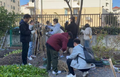 交流结束后,四叶草堂相关负责人苏老师与霍老师分别带领学生小组对智创农园进行参观学习。他们为同学们讲解了农园中的各种植物,同时也讲解了在农园中种植的小技巧以及防虫的装置。创智农园通过城市社区里的农园种植沟通邻里关系,是城市中一道独特的绿色风景线。创意十足的农业园区深深吸引着师生,让师生们在喧嚣的城市中感受到了绿色的气息。参观结束后,同学们根据分组依次进行了豌豆架搭建、树莓架搭建、清扫落叶、石子路界线清理以及植物识别数据采集,通过劳动更好地了解了社区花园理念的实践成果以及创智农园中各种植物的习性。