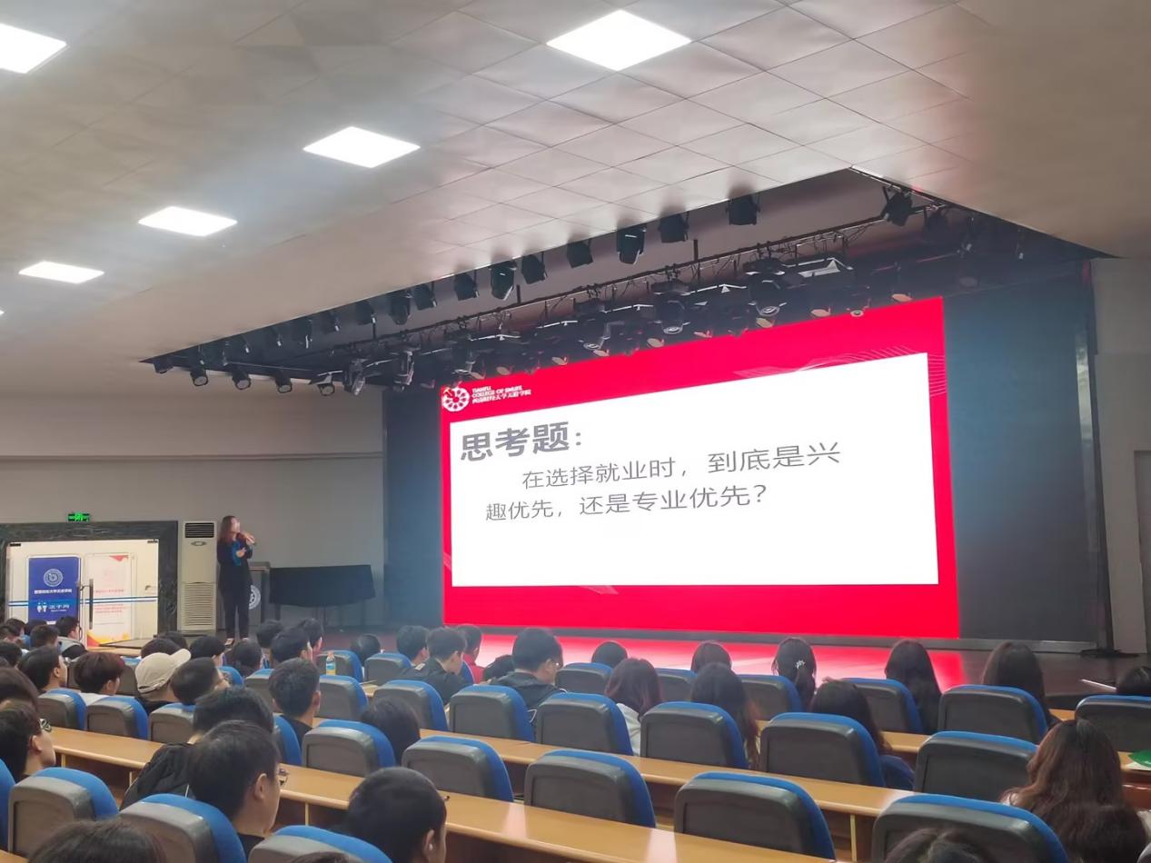 本次讲座主要围绕“五个一”展开,即“一道思考题”“一道准备题”“一种变化”“一种心态”“一个行动”。讲座伊始,常荣以“在选择就业时,到底是兴趣优先,还是专业优先?”这个引人深思的问题开启了讲座。她深度讲述了在生涯发展过程中,个人与职业互动、职业意愿、个人意愿之间的关系以及影响。她引用“明尼苏达工作适应论”这一理论,向同学们阐释了个人与职业的选择是一个相互影响、双向互动的过程。随后,常荣引领同学们共同探讨了“在大学的四年里,应该根据兴趣来培养能力,还是依据专业来培养能力?”这个关键问题。她强调,技能和知识的掌握需要结合具体的工作实践,希望同学们能兼顾个人和企业角度去增进技能,提升自己的综合能力。