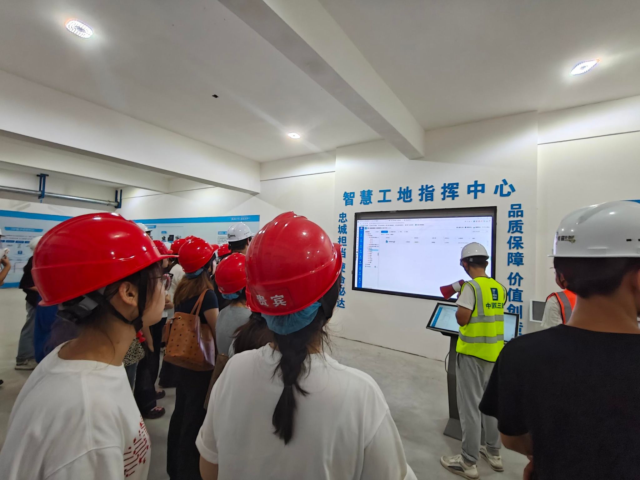 参观过程中,首先,项目工程师通过智慧工地系统的大屏幕实时展示了基地的运营数据,包括设备运作状态、物料采购数据和现场交通情况等。工程师指出,这些数据对优化施工流程、提升管理效率和保障安全至关重要。