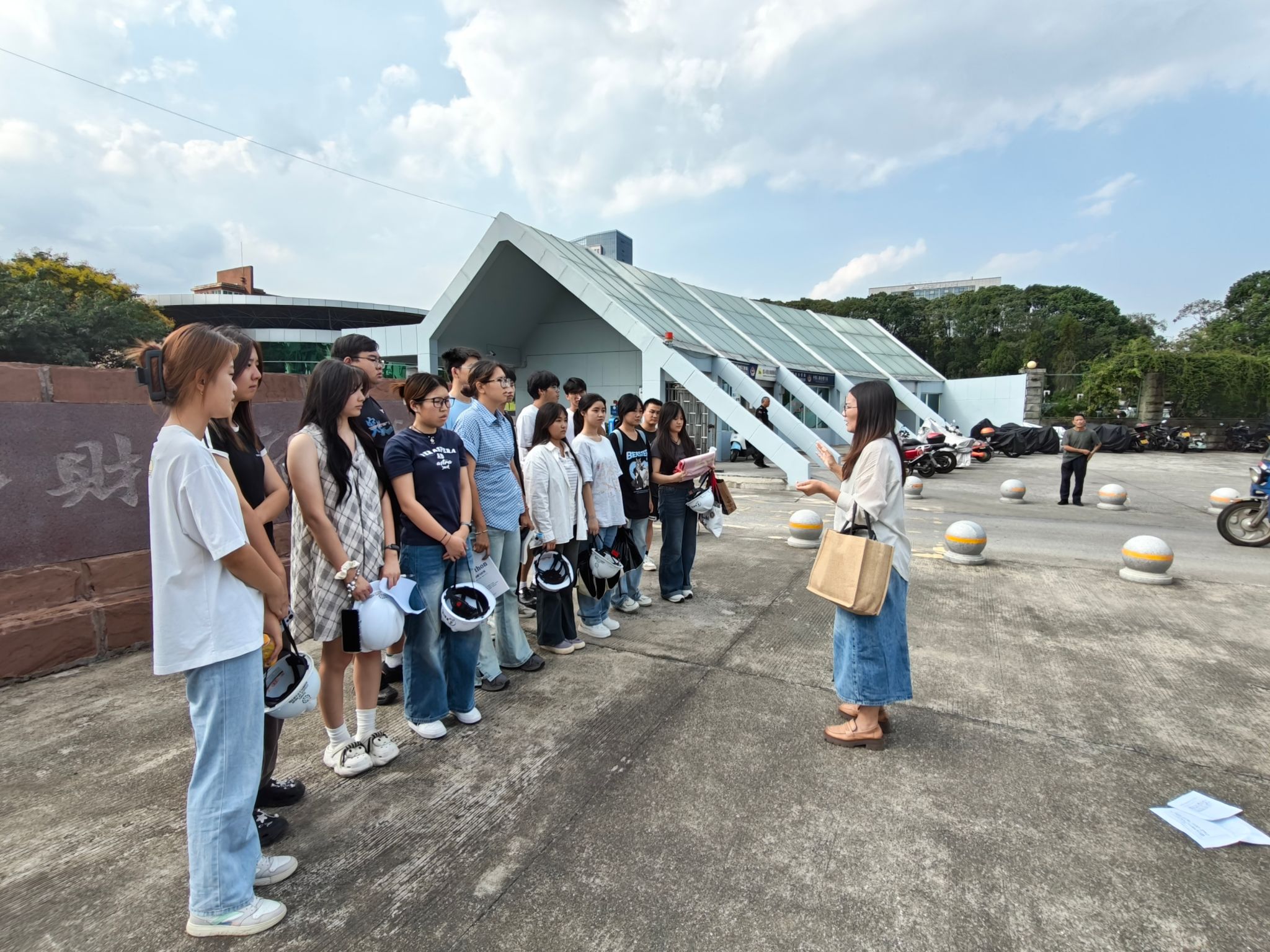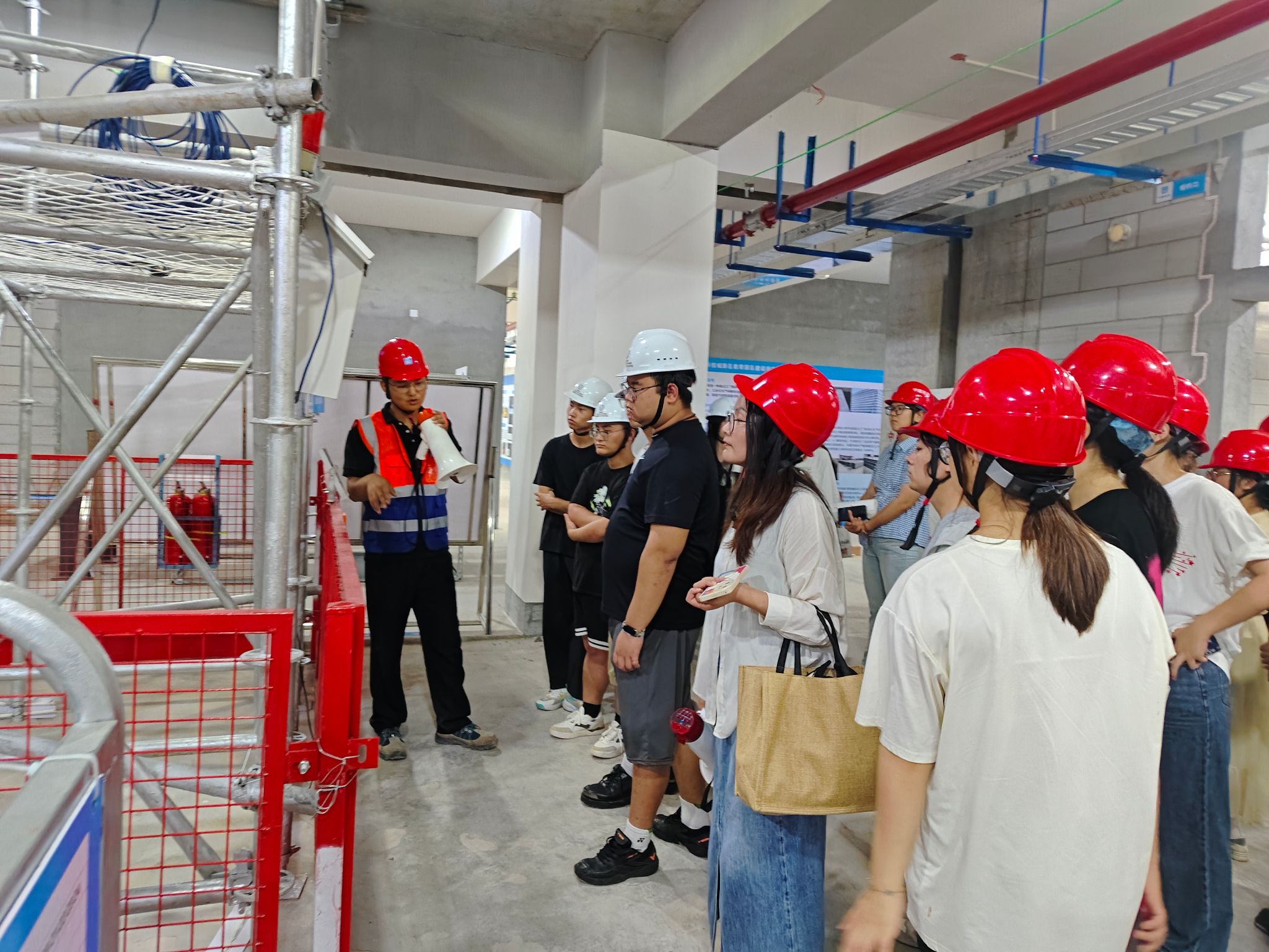 出发前,陈静强调了本次实践学习的安全要点,包括交通安全、设备操作规范、个人防护用品佩戴以及应急处置流程等。抵达项目后,项目安全总监首先为师生们讲解了施工现场安全须知,包括安全帽的正确佩戴方法和注意事项。在完成安全准备后,师生们在项目安全总监、项目工程师、陈静的引导下进入模范项目基地。