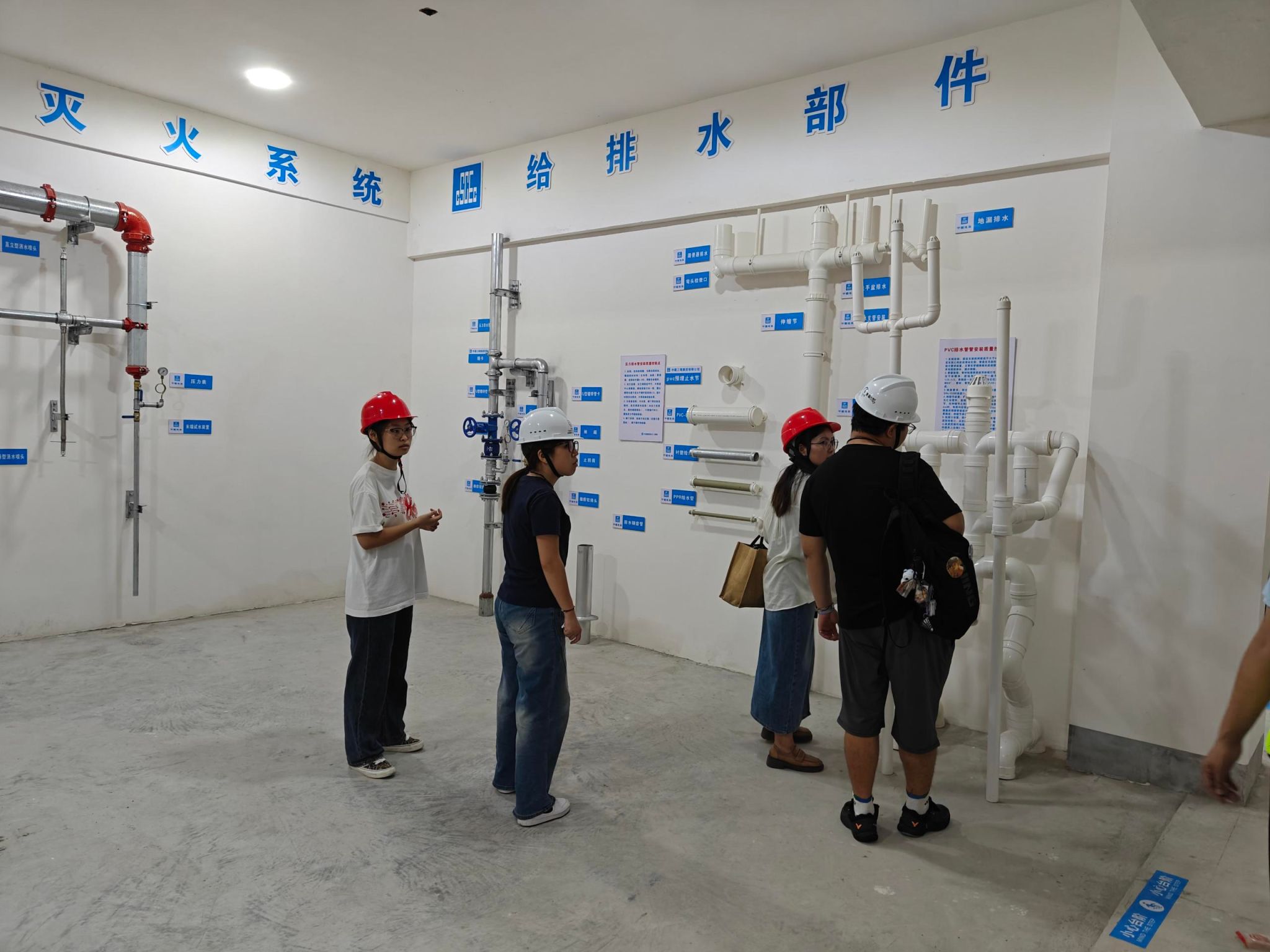 最后在施工现场的实体构件展示区,现场工程师及陈静介绍了装配式预制构件、现浇构件,包括梁、板、柱、楼梯等节点,也讲解了安装工程的强电设备、给排水管道、消防系统和室内部分装饰装修材料及工艺,他们的讲解让同学们脑海中抽象的理论转化为具体的实践认知。