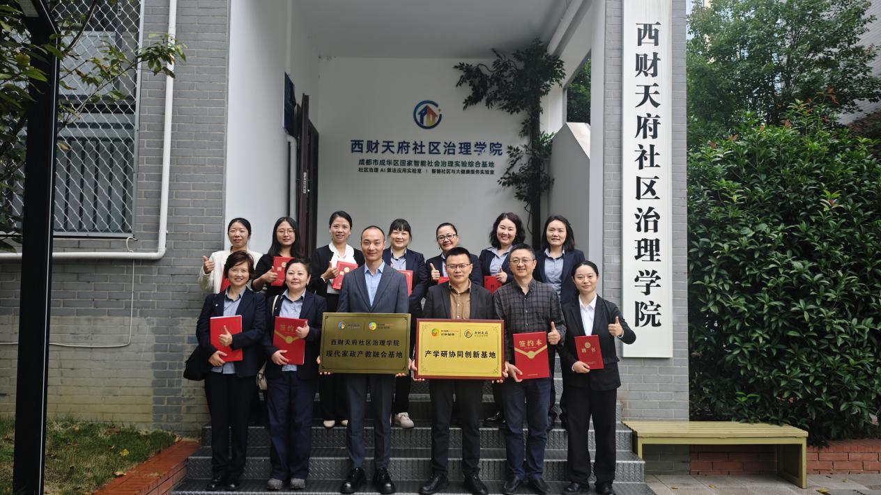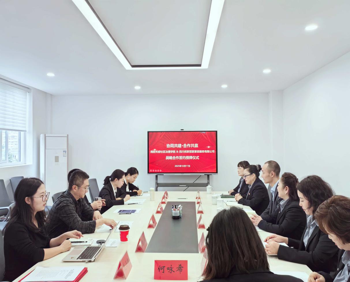 10月17日上午,西财天府社区治理学院与四川优联管家家政服务有限公司“协同共建·合作共赢”战略合作签约授牌仪式在学院三楼会议室举行。西南财经大学天府学院副校长兼社区治理学院院长苟兴才,四川优联管家家政服务有限公司总经理陈瑜出席活动并致辞。社区治理学院副院长张翼、院长助理李玥和对方企业副总经理张兴涛、党支部书记汪瑛以及双方相关教师和工作人员共同出席见证。此次仪式标志着双方在家政专业建设、人才培养及“家政进社区”项目合作中,实现了产教融合的实质性突破。
