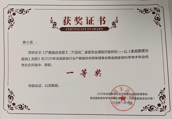 在此次会议中,学院教师团队表现优异,取得了一系列亮眼成绩,进一步推动学校在家政领域实现从“积极参与者”向“重要贡献者”的角色跃升。由李玥牵头完成的实践案例《平台赋能:“新家政”撬动产教融合大生态》,以其创新的模式与显著的应用价值,在众多参评案例中脱颖而出,荣获大会“产教融合优秀案例”奖。黄小芸撰写的《产教融合背景下“产品化”家政专业课程开发研究——以<家庭整理与收纳>为例》论文,凭借新颖的视角、深入的内容和严谨的逻辑,斩获论文一等奖。
