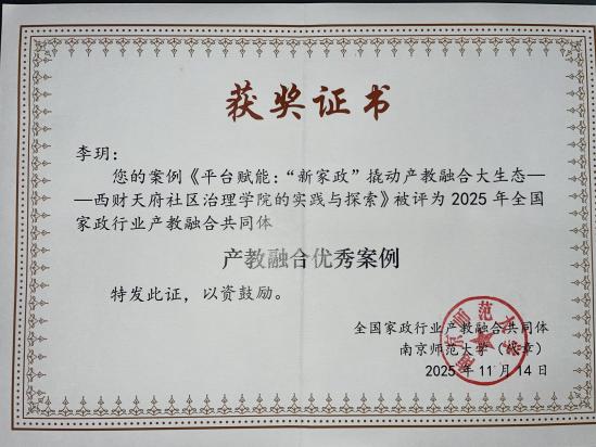 11月14日至16日,2025年全国家政行业产教融合共同体理事会暨金陵家政科学学术年会在成都举行。社区治理学院社区家政教师团队首次集体参会表现优异,所提交的1篇案例与3篇学术论文全部入选,均受邀在平行论坛作专题报告,实现了全部入选、全员汇报。经大会评审,团队荣获“产教融合优秀案例”与论文一等奖两项重要奖项。学院院长助理李玥获聘为全国家政行业产教融合共同体西部“一老一小”产教融合研究院首批专家。多项成果的取得,充分展现学校在家政领域的教研实力与影响力。