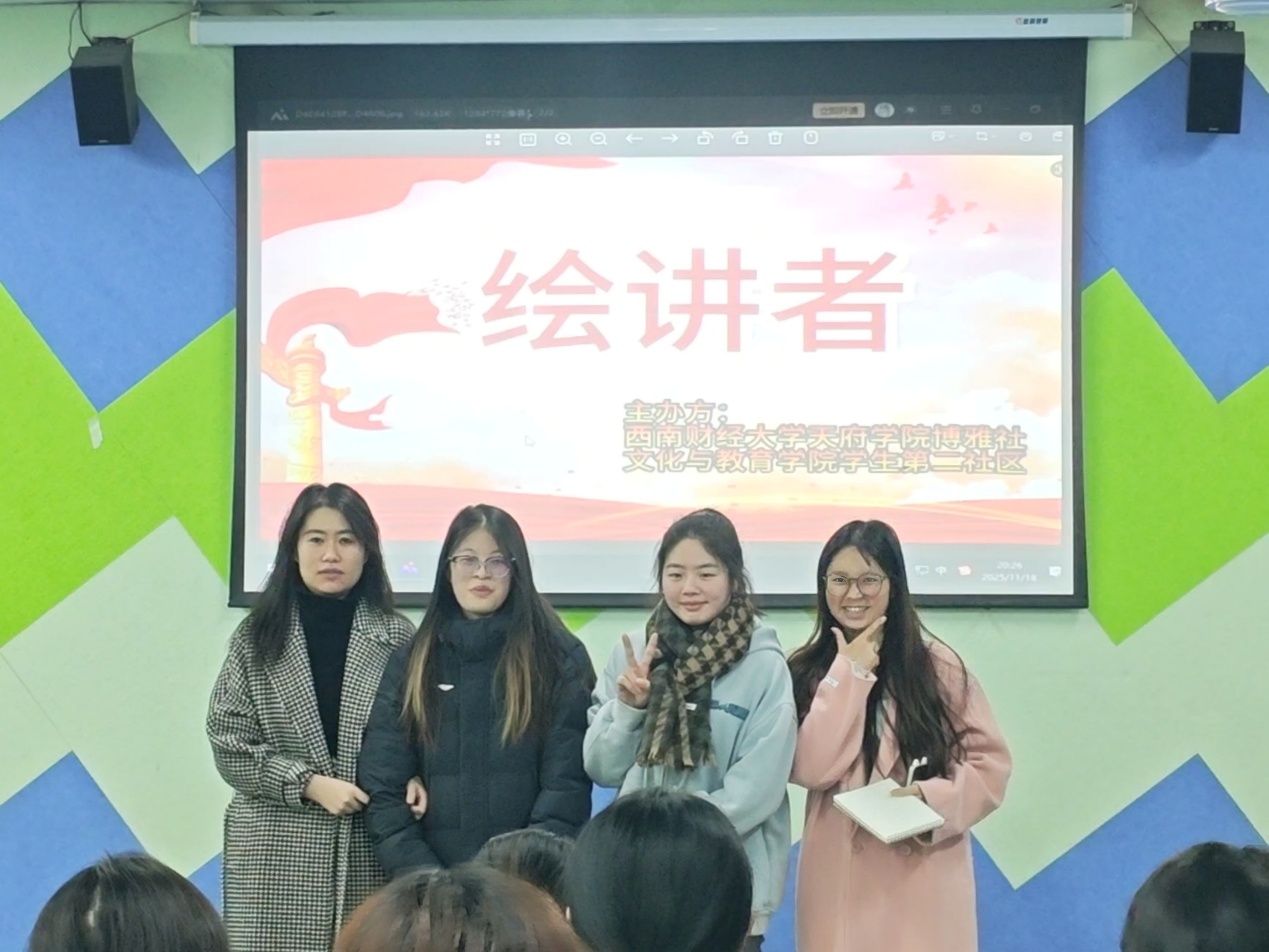 为培养学生的教学实践能力,提升综合竞争力,11月18日晚,文化与教育学院博雅社携手文化与教育学院学生第二社区,在三教声乐实训室面向文化与教育学院全体学生联合举办了2025年秋季学期第三期绘讲者活动。本次活动由文化与教育学院教师夏蜻现场指导,邱英杰同学主持,学院学生积极参与。