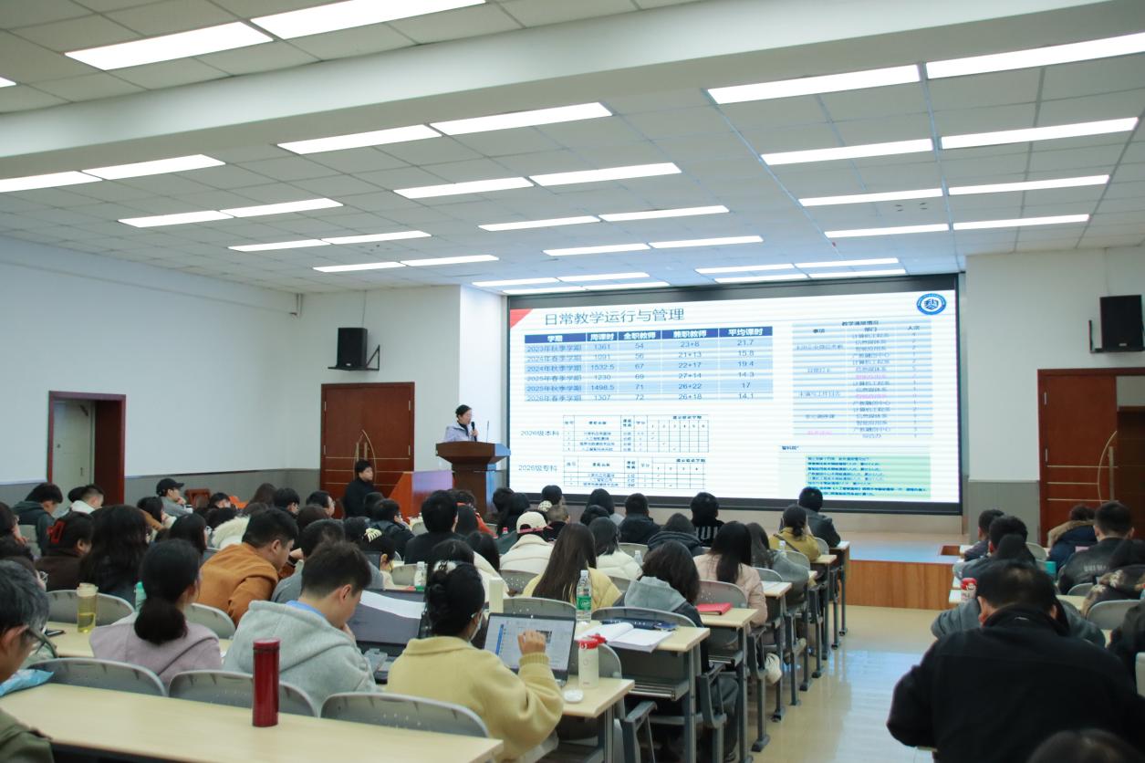 院长助理刘丹以“凝心聚力抓内涵,守正创新保运行”为主题,从内涵式建设和保障运行两大维度,系统部署了新学期教学管理工作。在内涵建设方面,她重点通报了省级特色教材(AI数字教材)的建设成果,并详细介绍了《计算机思维与人工智能基础》等6部立项教材的推进情况。在运行保障层面,她深入分析了近几学期的教学运行数据,针对2025年秋季学期巡课中发现的学生行为规范、教师教学开展、课程任务设计等问题,提出了及时整改反馈、强化班级协同管理、调整课堂与课程设置等具体措施。同时,她还通报了师资队伍管理的考勤细则与考核结果,强调要以精细管理夯实教学根基,以内涵建设赋能学院高质量发展。