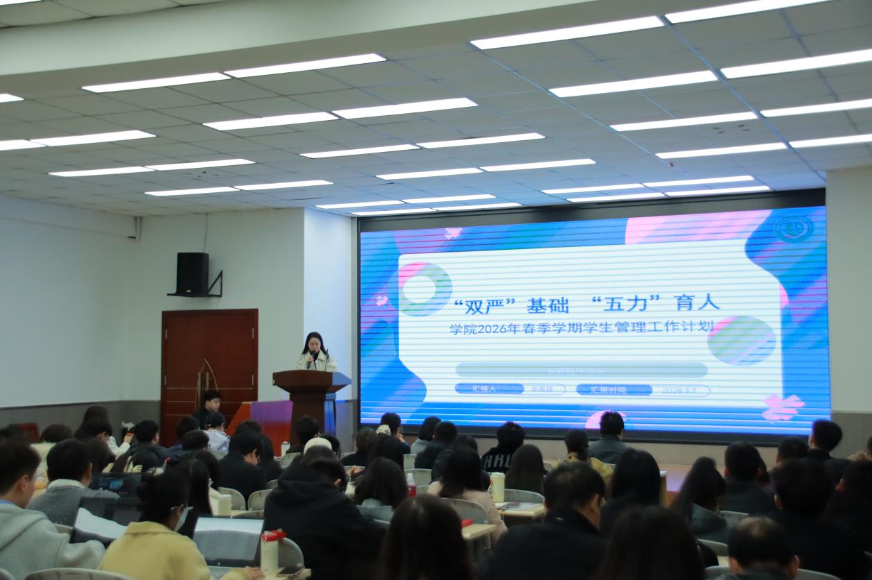 学院分党委副书记李禹锌以“‘双严’基础,‘五力’育人”为主题,系统部署了2026年春季学期学生管理工作计划。她围绕“党建先锋力、学风向心力、育人协同力、思政浸润力、文化影响力”五大维度,明确了以“严谨治学、严格要求”为基础的育人路径。在育人协同力方面,她通报了2025届毕业生各专业签约率及整体就业率,并提出了分阶段就业目标;在学风向心力建设上,针对学生考勤异常率、考试违纪率等问题,从内因和外因两方面深入剖析,并提出了精准施策的改进方向;在思政浸润力方面,她强调运用“因事、因时、因势”三因工作法,融入“三重一网”开展思政教育;在文化影响力方面,她规划了春季运动会、“中华颂”传统文化节、心理健康系列活动等,以文化浸润助力学生成长成才。