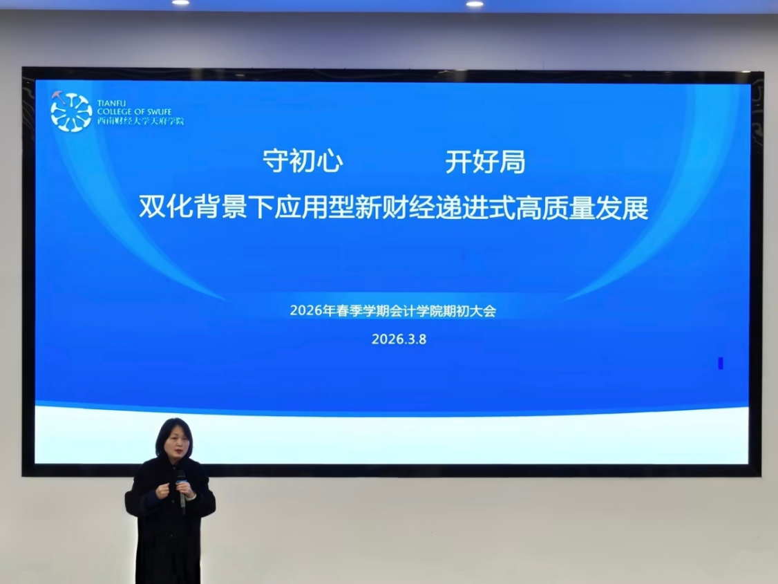 3月8日上午,会计学院2026年春季学期期初全体教职工会议在德阳校区B301报告厅举行。会议围绕“守初心,开好局——双化背景下应用型新财经递进式高质量发展”主题,全面回顾过往成绩,精心擘画新学期发展路径。西南财经大学天府学院副校长张之明、校长助理高亮,四川省经济学与财政学教学指导委员会秘书长、西南财经大学财税学院刘蓉教授应邀出席会议,会计学院院长陈真子主持会议。