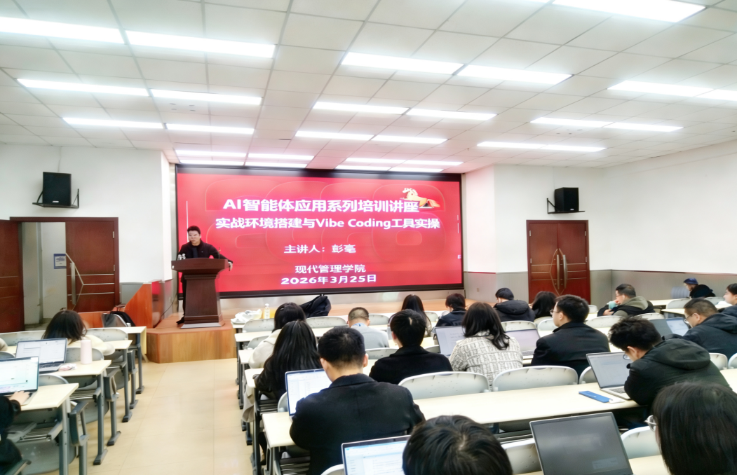 为深化AI智能体技术的实操应用,推动智能工具与教育教学场景深度融合落地,3月25日,现代管理学院举办“AI智能体实战环境搭建与Vibe Coding工具实操”专题培训。本次培训特邀人工智能应用领域专家彭毫主讲,全院教师及学生代表全程参与,沉浸式锤炼AI技术实操应用能力。