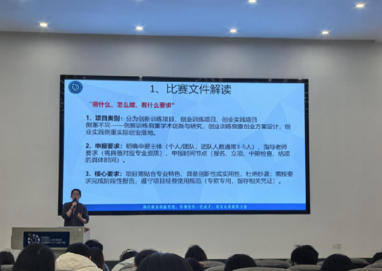周鑫宇系统介绍了学校学生竞赛管理办法,详细解读了Ⅰ类、Ⅱ类、Ⅲ类竞赛的划分标准,以及竞赛加分与课程免修等激励政策。随后,她围绕七大类竞赛项目展开介绍,包括会计、税务、审计类竞赛,案例类竞赛,能源低碳类,沙盘模拟类,数字AI类,同时分析了各类竞赛的侧重点与备赛策略,鼓励同学们根据自身兴趣与优势精准选择。针对大学生创新创业训练计划项目,周老师结合比赛文件,强调了跨学院、跨专业、跨年级组队的优势,详细说明了项目类别、申报要求及核心要点。在选题方面,她特别建议同学们要“贴合专业、小而精”,拒绝“大而空”,力求项目容易落地,鼓励大家立足本专业,聚焦一个具体的小切口,把小事做细,为后续参与“挑战杯”等高水平赛事打下坚实基础。