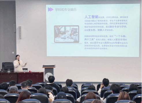 宣讲会分别从创新班培养目标、融合式专业方向、教与学的创新模式和培养成效等方面对优才创新班进行了详细介绍。马俊强调,人工智能的发展,对学生跨专业、跨学科学习的能力提出了更高的要求,学生不仅要掌握相关专业的核心知识框架和技能,同时还要掌握相邻或相近专业的知识和技能,通过融合专业与学科,实现复合型、创新人才的培养。艺术与传媒学院优才创新班利用学校的学科优势,根据人才就业市场的需求,结合设计专业、商科专业和传媒专业的内在联系和外延关系,在课程体系设计和教学团队组织中体现了学科和专业的融合。曲雅萍表示,优才创新班将采用“N+5”导师制学习和“3+1”模式,翻转课堂、游戏化学习、问题导向式学习、项目式学习、混合式学习、人机协同课堂教学等新的教学方式,为学生提供沉浸式、交互式、实践式的教学体验,实现教师智能教学、学生智能学习和作业个性化推荐等目标,构建人机协同教学新样态。