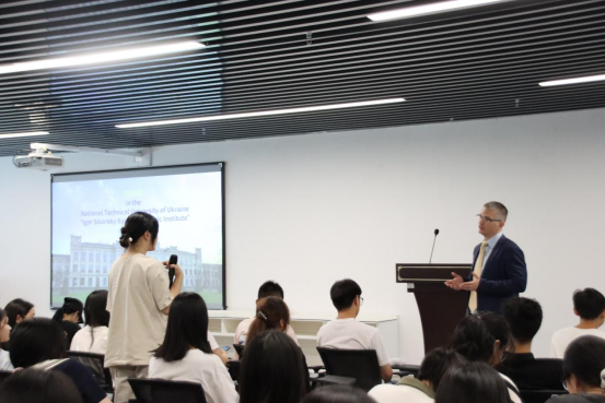 在最后的互动答疑环节,学生们围绕语言问题、学习时间和学习方式等内容踊跃提问,Vitaly博士、段满堂及Olha耐心细致地为同学们答疑解惑,同时高度肯定了同学们的学习热忱与英语能力,并鼓励大家积极投身于各类项目实践中,提升个人竞争力。