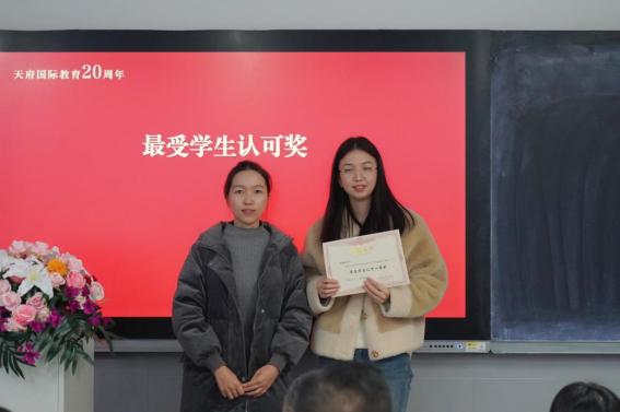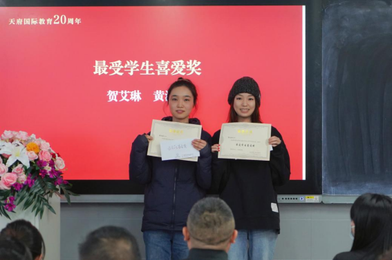 为最受学生喜爱奖获得者黄润婷、贺艾琳颁奖