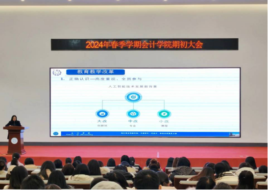 3月2日下午,会计学院在德阳校区C203报告厅召开了2024年春季学期全体教职工期初大会。会议由会计学院院长陈真子主持,学院党总支副书记孟仁丹、林琳、夏丹、副院长许静、院长助理陈茜、张娟及学院全体教职工参加。会议围绕“贯彻落实立德树人根本任务、学校教育教学思想和人才培养理念以及人工智能背景下的‘大改、中改、小改’的有效开展”这三项主题,总结了2023年的工作,并就2024年重点工作进行了部署。