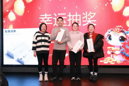 幸运抽奖环节无疑是本次年会的一大亮点。随着抽奖箱的开启,现场气氛瞬间被点燃。在场人员都怀揣着期待的心情,希望自己能够成为幸运儿。从四等奖到一等奖,每一轮抽奖都牵动着在场每一个人的心弦。当幸运者的名字被一一揭晓时,现场爆发出阵阵热烈的掌声和欢呼声。中奖者们脸上洋溢着喜悦的笑容,领取了丰厚的奖品,为这个美好的夜晚增添了更多的欢乐和惊喜。