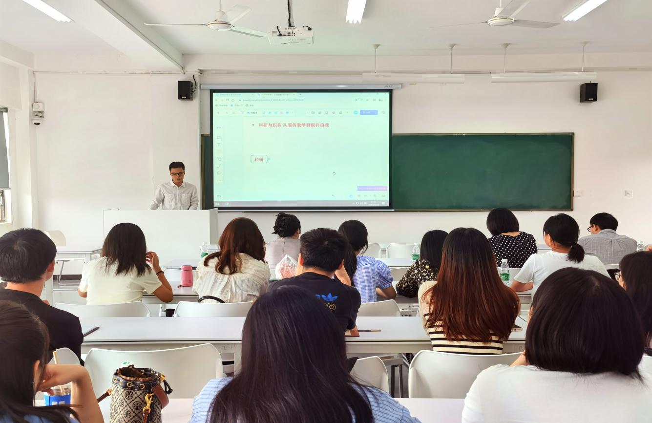 王晓峰以“科研与职称:从服务教学到提升自我”为主题作了分享。他表示,做科研需经历从积累、模仿、转化再至厚积薄发等环节,只有脚踏实地方能做好科研工作,并介绍了各类科研项目的基本情况、列举了多项课题申报流程。他结合学院科研工作的开展情况,对教师职称评定的基本条件、前期资料准备以及注意事项进行了说明。