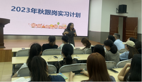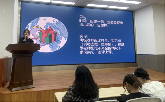 邓毅就见习的安全问题与纪律要求进行了详细的阐释与重点提醒。她提醒学生在实习期间要注意两个方面的安全,一是自身安全,二是幼儿园中孩子们的安全,并就安全细则展开了具体阐释。郭丹与颜熙宸分别就实习流程以及实习规范、实习管理办法进行了详尽的介绍。