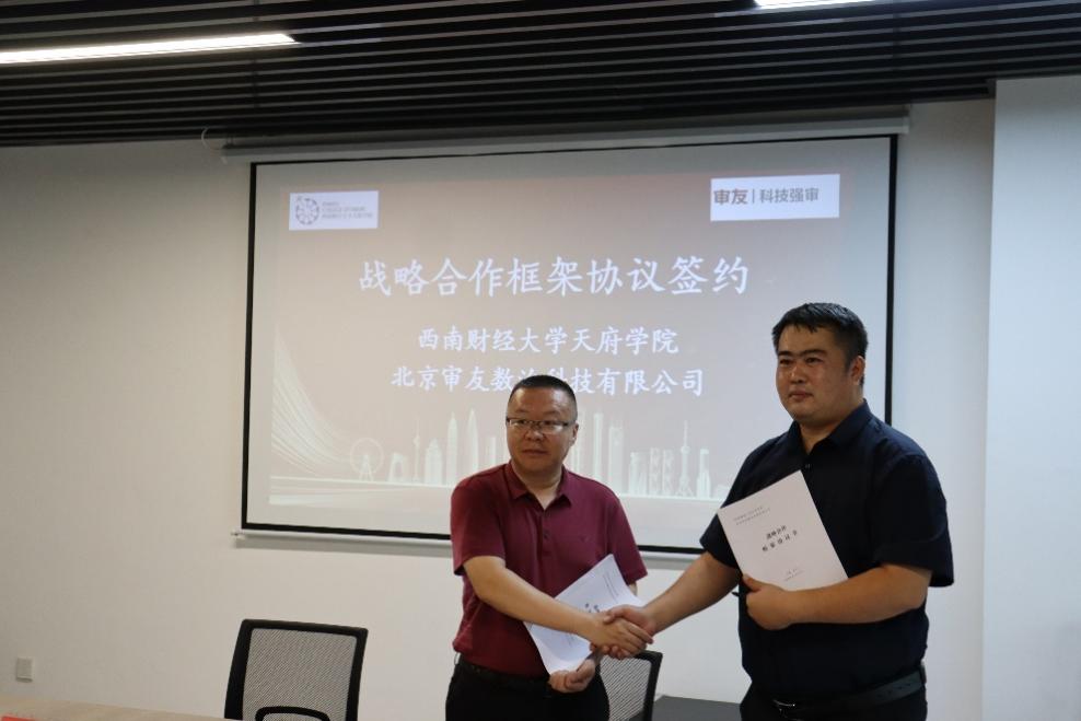 6月27日下午,西南财经大学天府学院与北京审友数治科技有限公司战略合作框架协议签约暨工程智慧审计中心成立揭牌仪式在创新中心501会议室举行。北京审友数治科技有限公司西南/华中大区总监许海峰、学校建筑与工程学院执行院长韩记、学院副院长范香、学院工程审计专业负责人陈静以及工程审计专业全体教师参与仪式。陈静担任本次仪式的主持人。