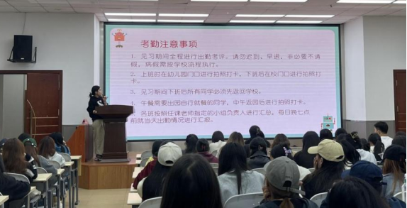 大会尾声,郭丹总结了动员大会的核心精神,并向同学们提出了三点明确要求:一是要深刻认识见习的重要意义和具体任务;二是要将理论知识与实践紧密结合,充分利用见习机会检验所学,勤于观察,善于积累;三是重视沟通的艺术,面对问题时保持冷静,与幼儿园教师、园长及指导老师保持密切沟通。