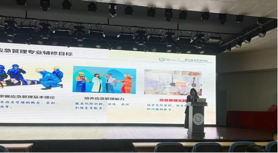 宣讲会由应急管理专业教师刘昱伶主持,她以通俗易懂的方式,首先从专业的历史沿革、学科特色及其在当今社会的重要作用等方面进行了详细介绍。她指出,应急管理专业不仅涵盖自然灾害、事故灾难、公共卫生事件等紧急情况的预防、应对和恢复知识,还注重培养学生的危机意识、应急决策能力和组织协调能力。