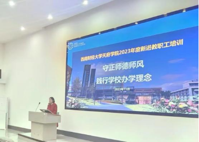 在绵阳校区的培训会上,史正刚的主题讲座围绕着师德师风解读、教师职业道德、师德师风建设三个方面展开,全方位诠释了教师职业的内涵。他强调,教师作为育人的主体,承担着培养下一代的重任,因此必须以身作则,成为学生的楷模。他倡导教师们要争做有理想信念,有道德情操,有扎实知识,有仁爱之心的“四有”好老师,也要做学生锤炼品格、学习知识、创新思维、奉献祖国的引路人。史正刚建议老师们要不断进行教学反思,在反思中提升,在反思中创新,在反思中成长。此外他还重点介绍了天府学院的办学理念,并希望新进教职工能够肩负起为党育人、为国育才的重任。