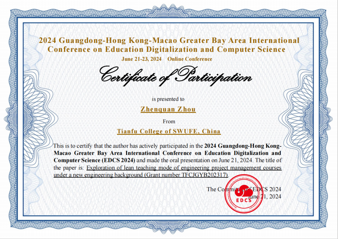 2024年粤港澳大湾区教育数字化与计算机科学国际学术会议(EDCS 2024)于6月21日在中国深圳召开。本次国际会议聚焦教育与人工智能技术应用,希望就教学方式与教育资源的全面改革,提高教育质量和效率并扩大教育资源和学习机会,在促进教育公平和社会进步、提升创新能力和人才素质等方面进行讨论与交流。学校建筑与工程学院教师周桢佺受邀参与本次国际学术会议,完成了主题为“新工科背景下的精益化教学模式和管理的改革与实践:以工程项目管理类课程为例”的校级教学改革项目成果交流的学术口头报告,得到了本次大会主办方、行业专家和参会人员的一致肯定和积极反馈。