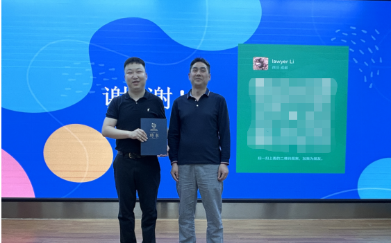 讲座中,黎闯还结合自己的求职经历和律师行业的实际情况,为同学们提出了关于职业规划的宝贵建议。在互动环节中,黎闯耐心细致地回答了同学们提出的问题,为大家提供了丰富的经验和见解。他的专业态度和真诚建议不时赢得了在场师生的阵阵掌声。最后,周忠杰为黎闯颁发了行业导师证书,感谢他为同学们带来的精彩分享。